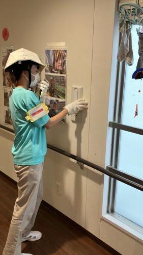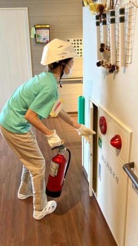 毎月防災に関する研修は行っていますが(避難方法の動画の視聴や消火器の使用方法など・・)特養階と宿直が揃って連携を取り合う訓練は毎年この時期に行っています