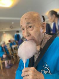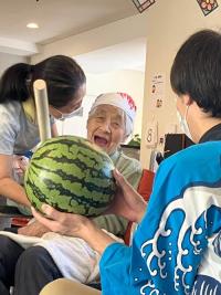 皆さん素敵な笑顔~最初にスイカをお披露目して、順番にスイカ割りを行いました。固くて手ごわかったのですが、最後は無事割ることができ、あまーいスイカをいただきました!(注:皆さんには割ったものとは別の物を用意しております)また、スイカだけでなく、綿あめもボランティアさんのご協力で振舞っていただき、こちらも大好評でした