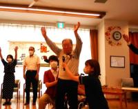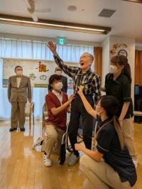 式典は、苑長や浦安市長の挨拶の後、祝賀者・長寿者の紹介、職員代表のメッセージ、祝賀者代表の入居者への花束贈呈&万歳三唱で締め。万歳三唱では、さすが人生の大先輩