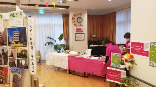 ボランティアによる綿あめ&フランクフルト&磯部餅の模擬店や、お花の販売、多肉植物販売&寄せ植え体験、ハンドネイル、福祉用具相談、喫茶スペースも昨年に引き続きパワーアップして開催