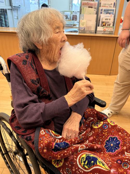 ボランティアさんに綿あめも作っていただき、あま~いおやつに、入居者さんからは、「こんな甘くて美味しいと思わなかった」「綿あめも好きだよ!」など、大好評の休日となりました
