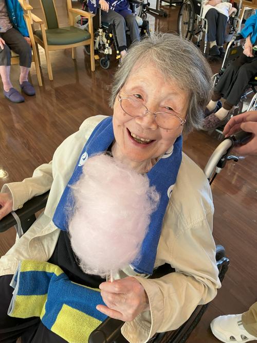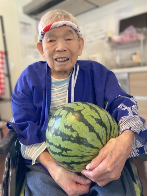 皆さん素敵な笑顔~最初にスイカをお披露目して、順番にスイカ割りを行いました。固くて手ごわかったのですが、最後は無事割ることができ、あまーいスイカをいただきました!(注:皆さんには割ったものとは別の物を用意しております)また、スイカだけでなく、綿あめもボランティアさんのご協力で振舞っていただき、こちらも大好評でした